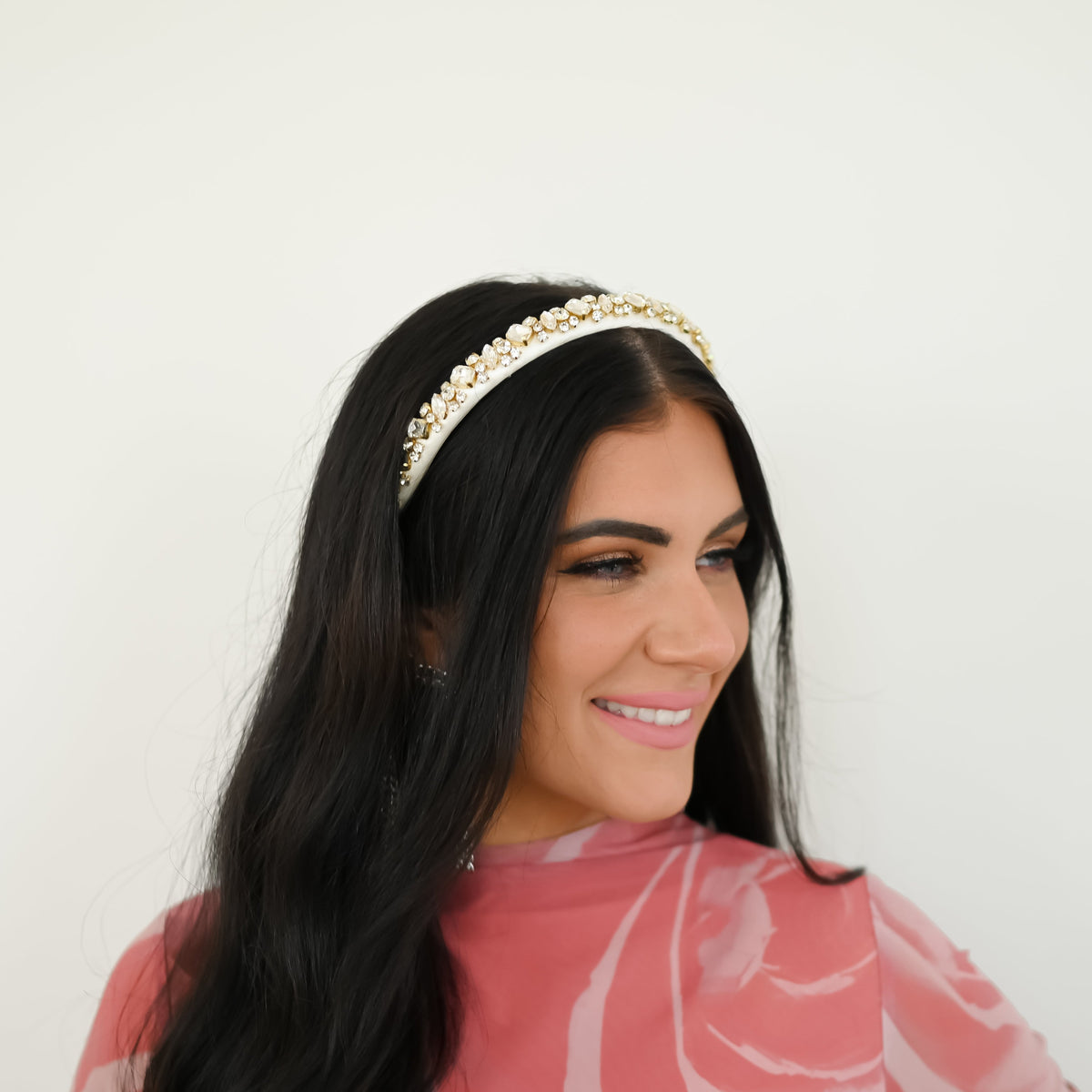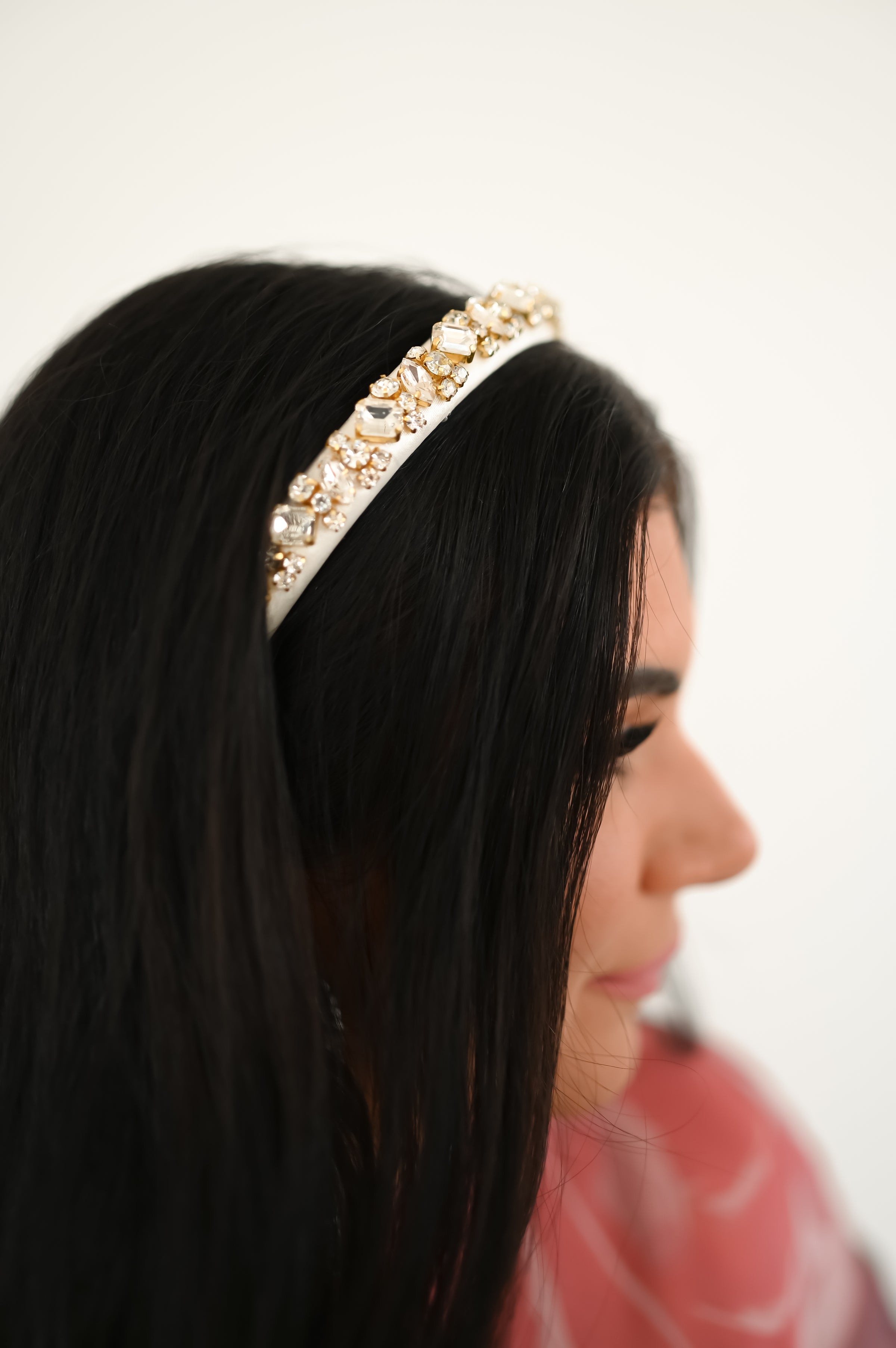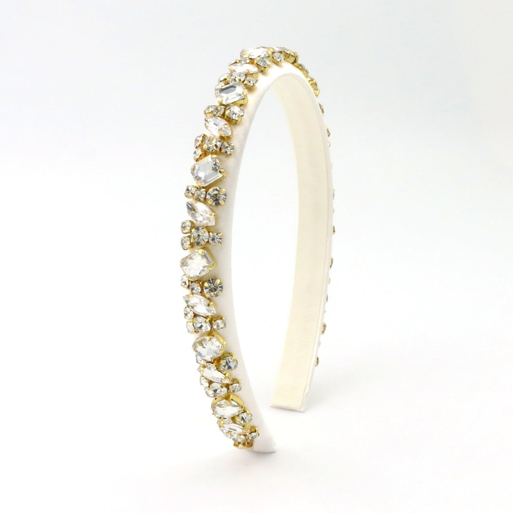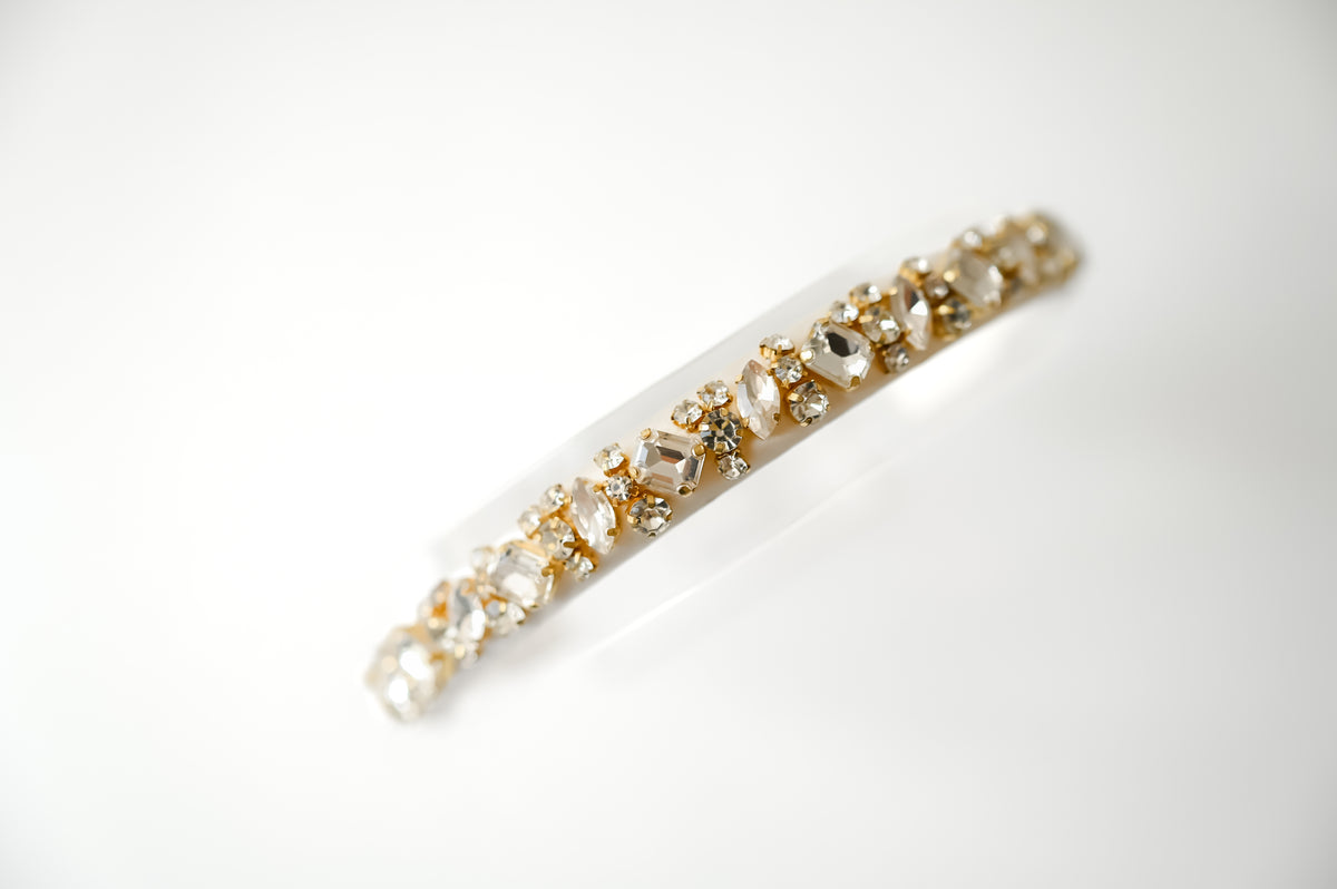• White satin band covered in multi-shaped clear crystals with 14k gold encasings