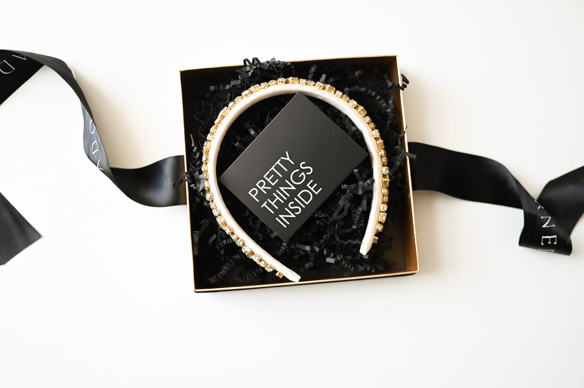 Crowns, Slim Crowns, Tiaras, Headpieces, Satin Bow Clips, Rhinestone Hats, & Crystal Scrunchies: Store your pieces in their boxes or pouches in a cool, dry place away from any direct heat sources. For longevity and color retention, we recommend limiting exposure to humidity, dust, and sunlight. Marks or stains can be spot-treated with cool water or a gentle detergent if necessary. Air-dry only.