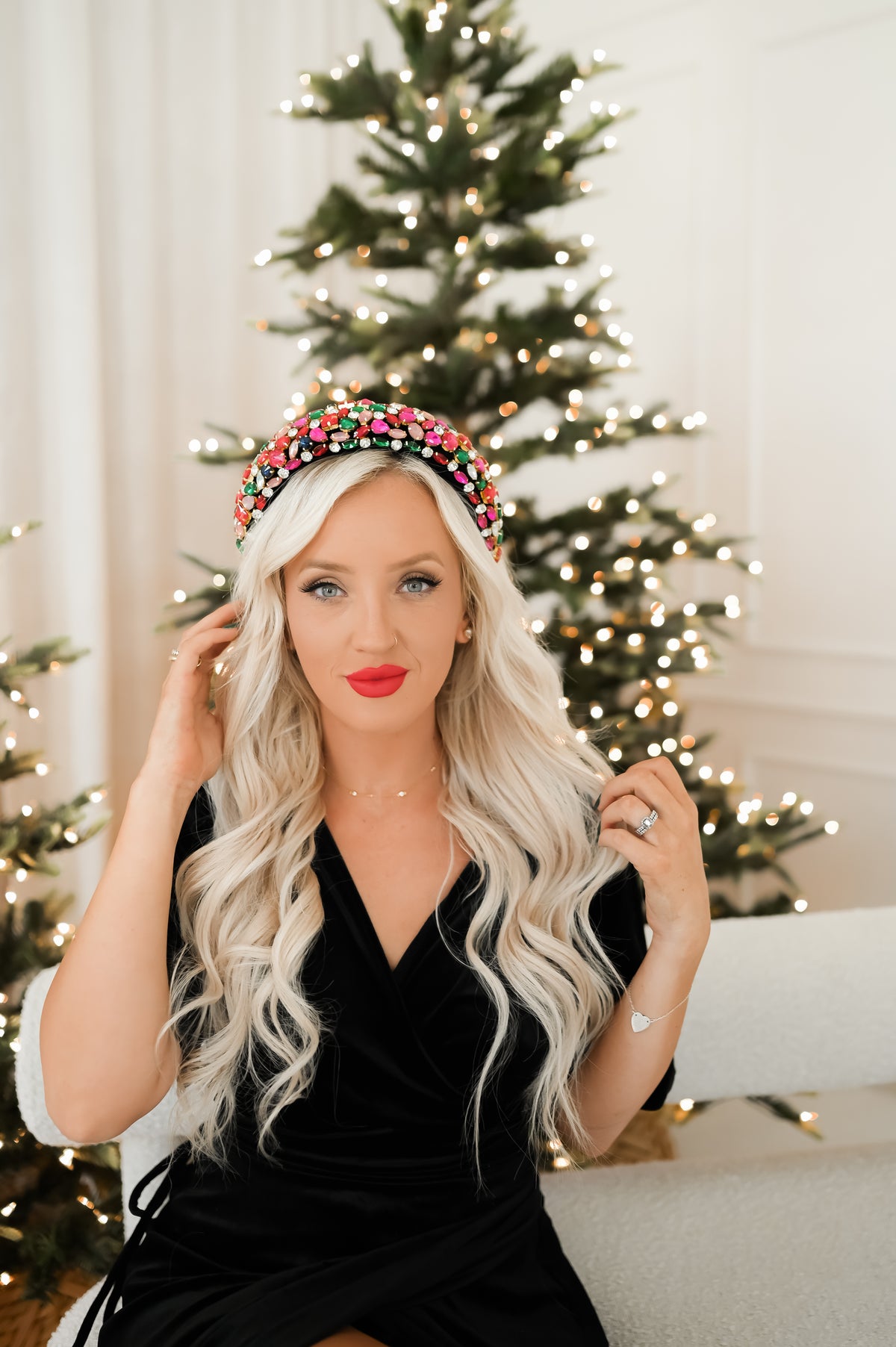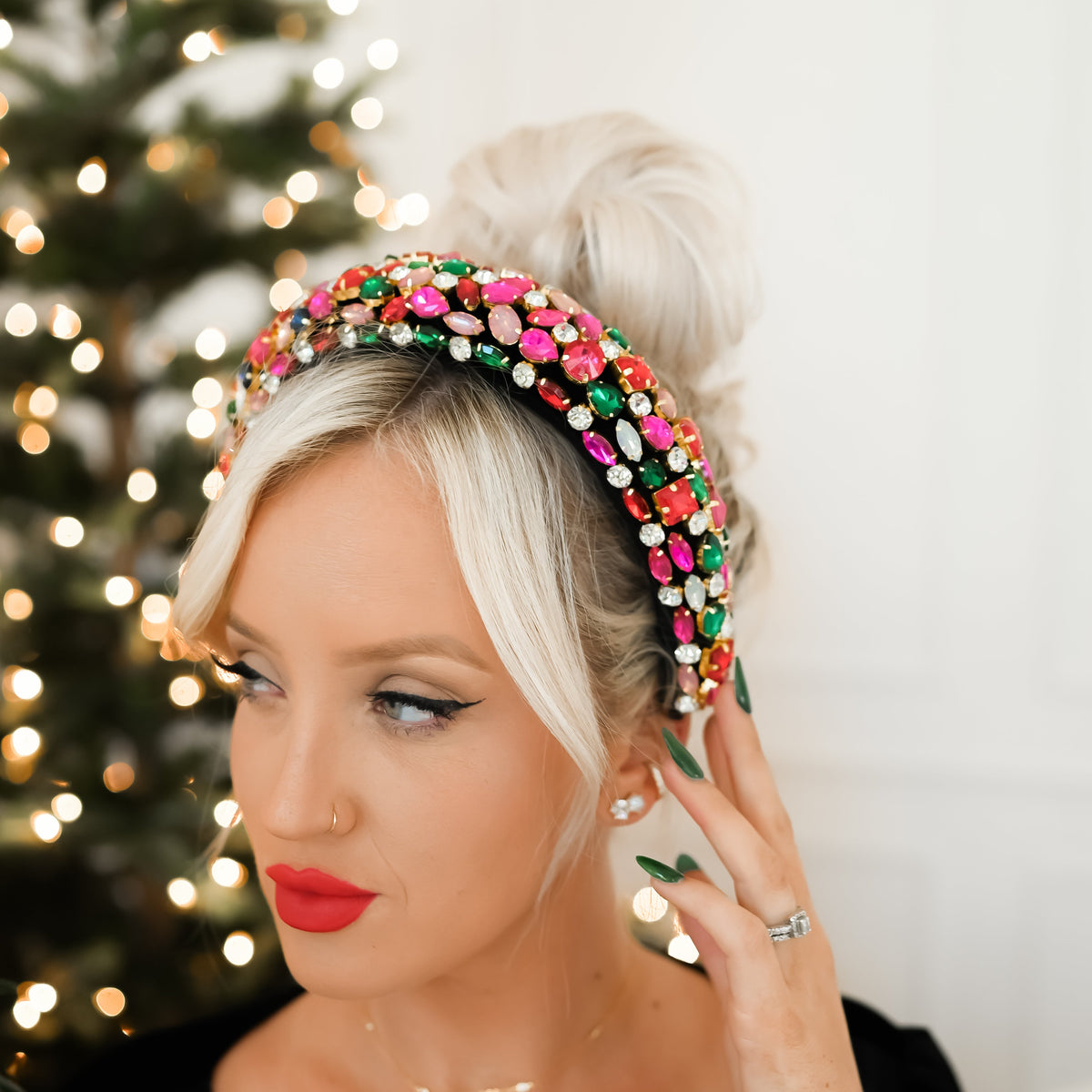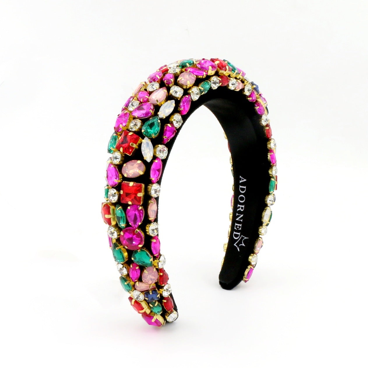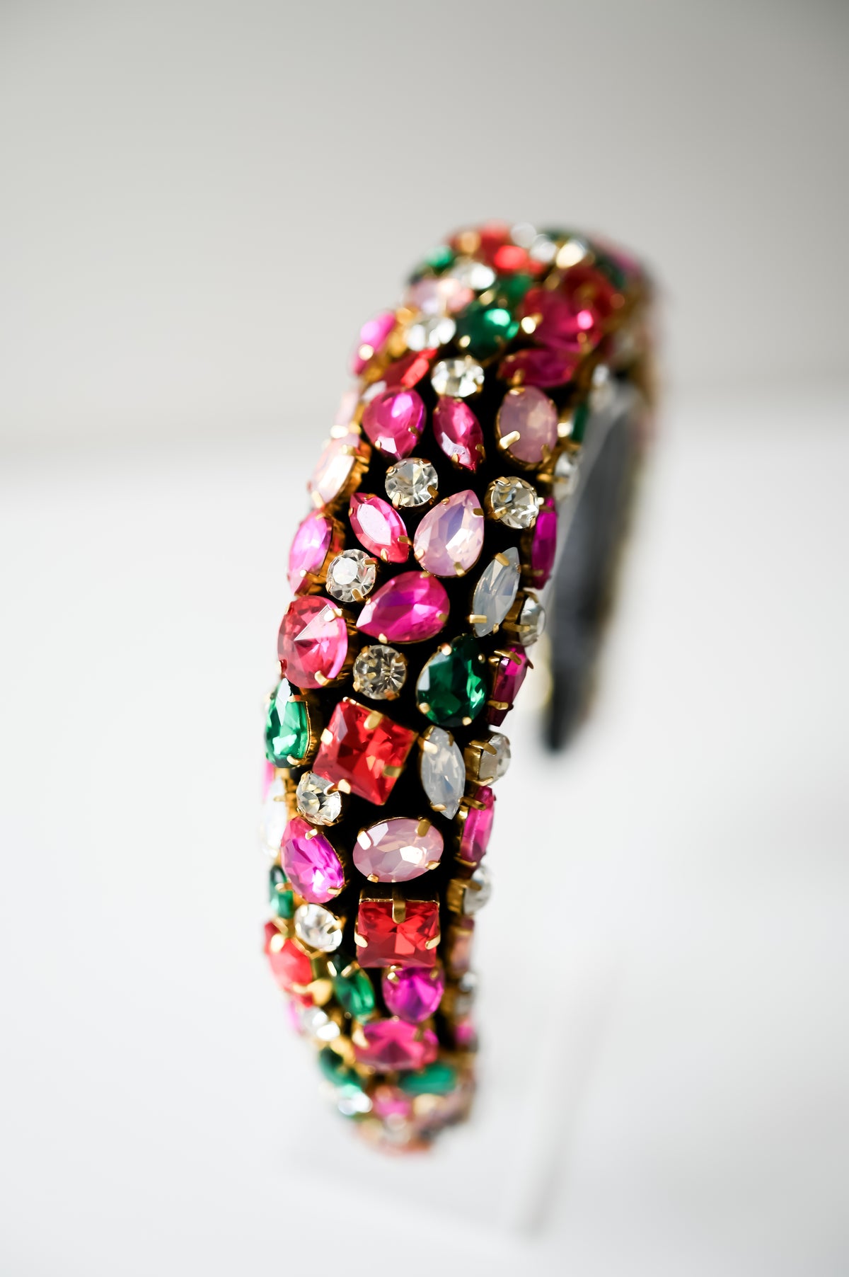 - 180-degree flexible black velvet band covered in multi-colored crystals with 14k gold casings