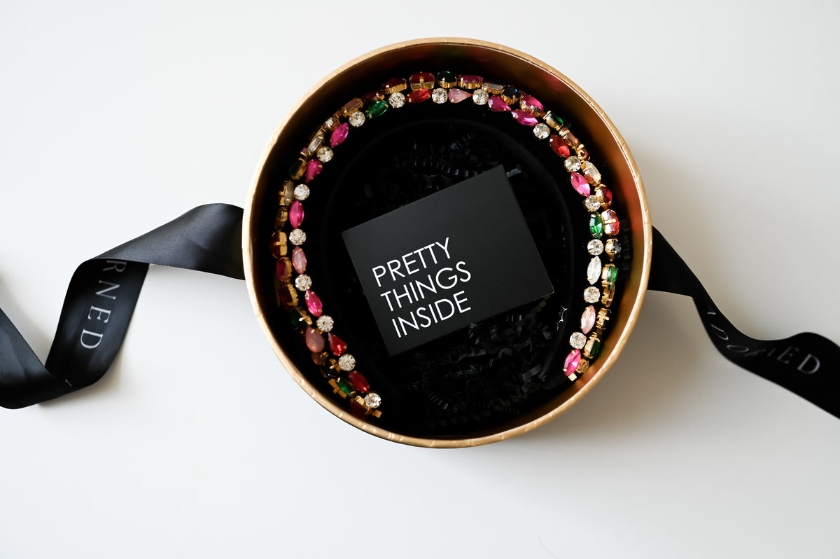 Dripping in decadence, the Jacqueline Padded Crown is the statement piece you've been dreaming of this season! The Jacqueline (with dustbox) arrives in our custom Adorned round black dustbox and features: