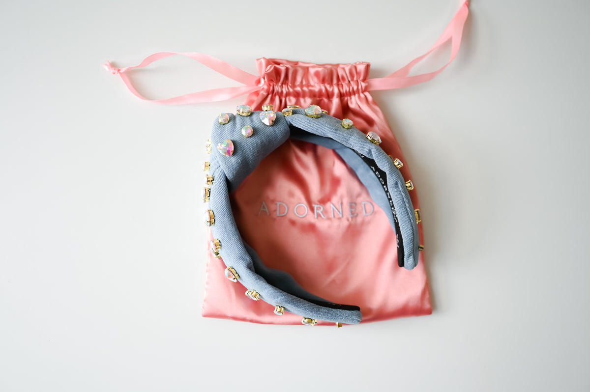 Crowns, Slim Crowns, Tiaras, Headpieces, Satin Bow Clips, Rhinestone Hats, & Crystal Scrunchies: Store your pieces in their boxes or pouches in a cool, dry place away from any direct heat sources. For longevity and color retention, we recommend limiting exposure to humidity, dust, and sunlight. Marks or stains can be spot-treated with cool water or a gentle detergent if necessary. Air-dry only.