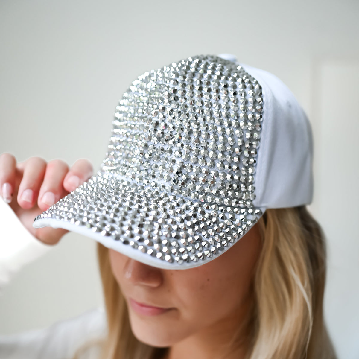 Elevate your everyday look with our rhinestone-studded hats, blending casual comfort with a touch of sparkle for effortless style! Each hat arrives in a custom Adorned embroidered XL satin pouch for convenient storage and travel.