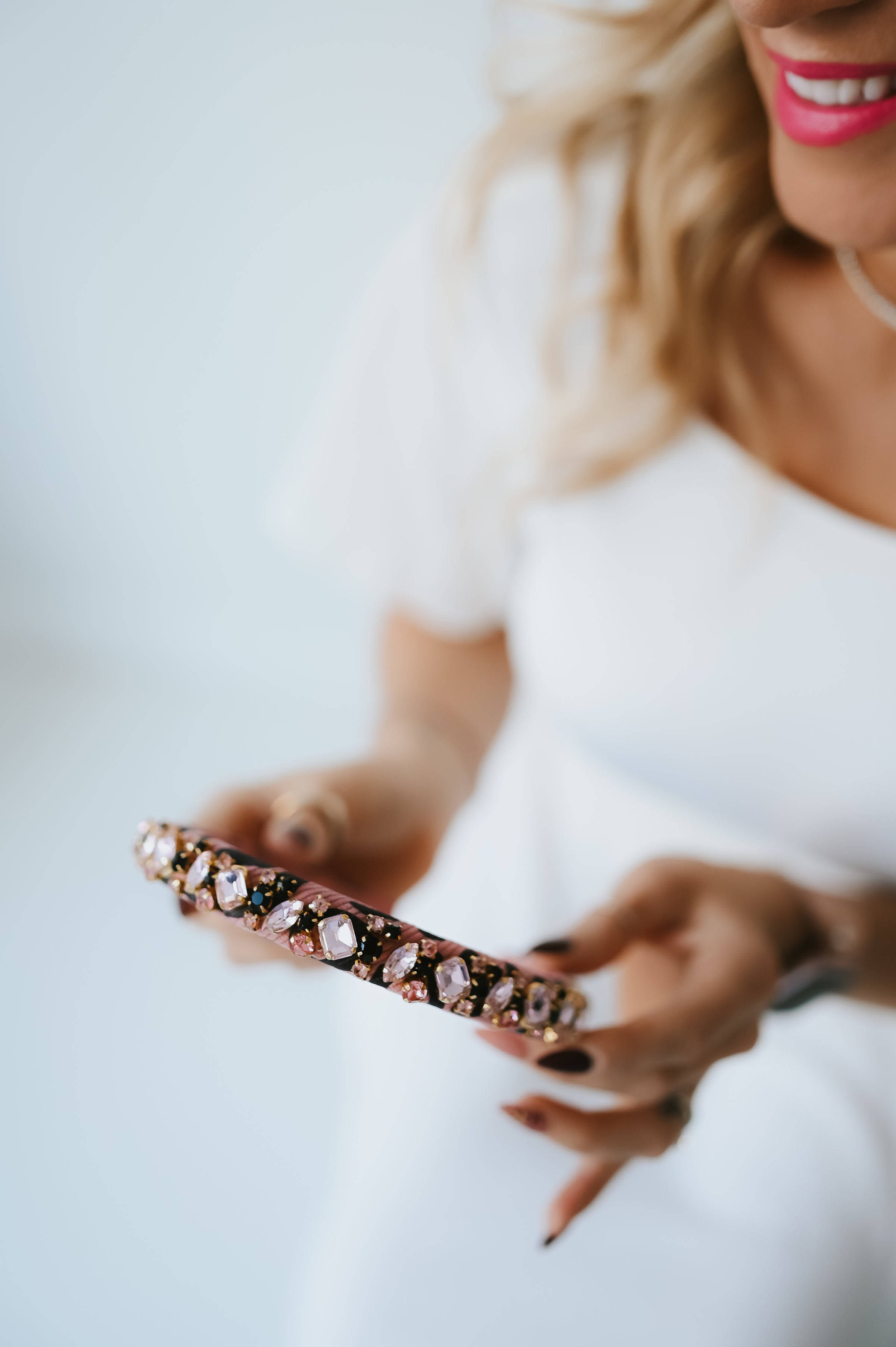 Crowns, Slim Crowns, Tiaras, Headpieces, Satin Bow Clips, Rhinestone Hats, & Crystal Scrunchies: Store your pieces in their boxes or pouches in a cool, dry place away from any direct heat sources. For longevity and color retention, we recommend limiting exposure to humidity, dust, and sunlight. Marks or stains can be spot-treated with cool water or a gentle detergent if necessary. Air-dry only.