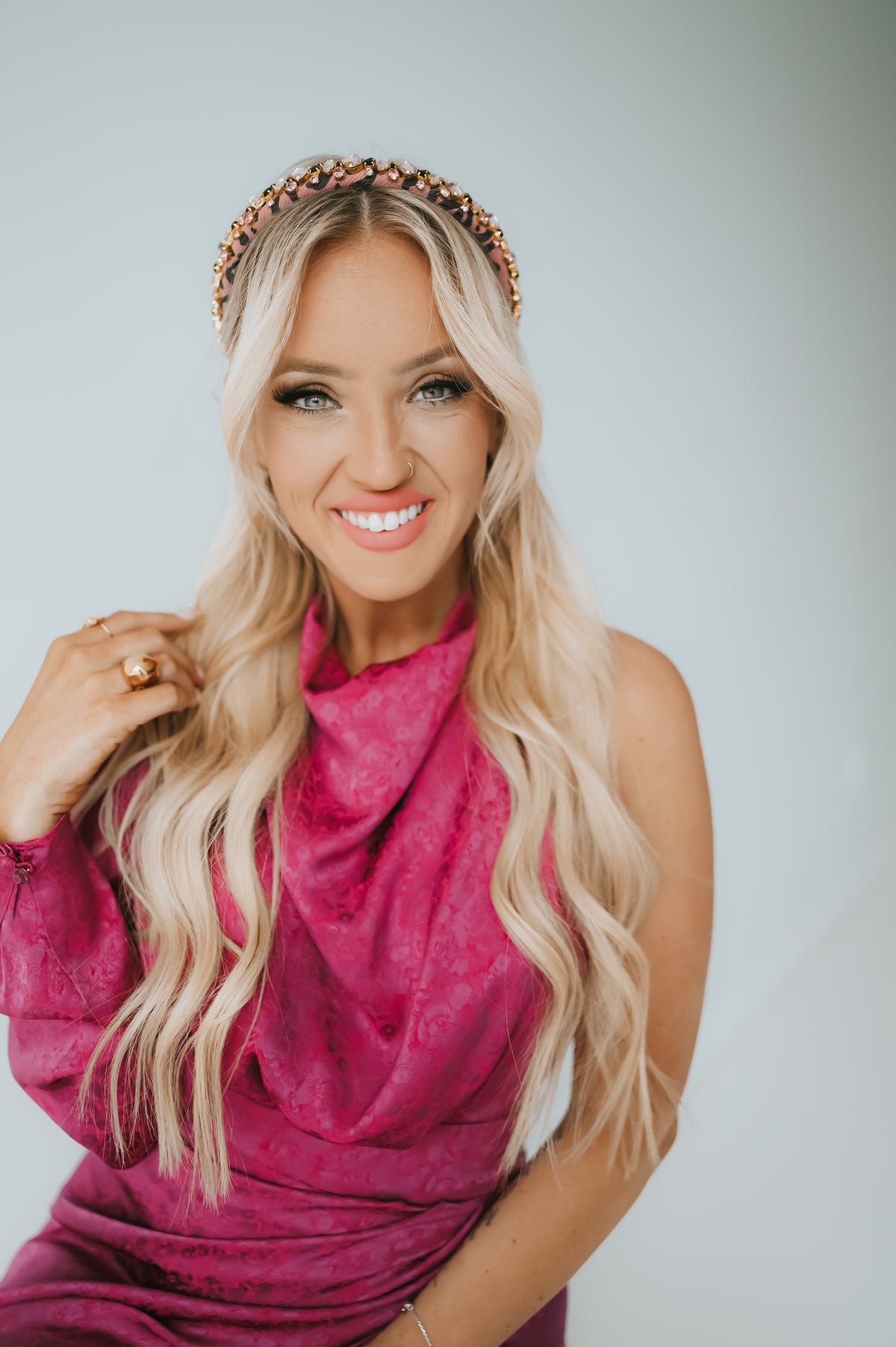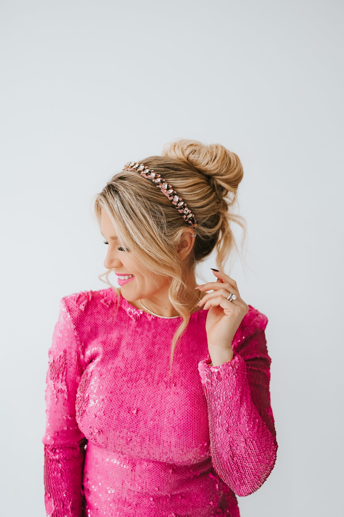 - Pink leopard-print band covered in multi-shaped pink and black crystals with gold 14-karat coated encasings