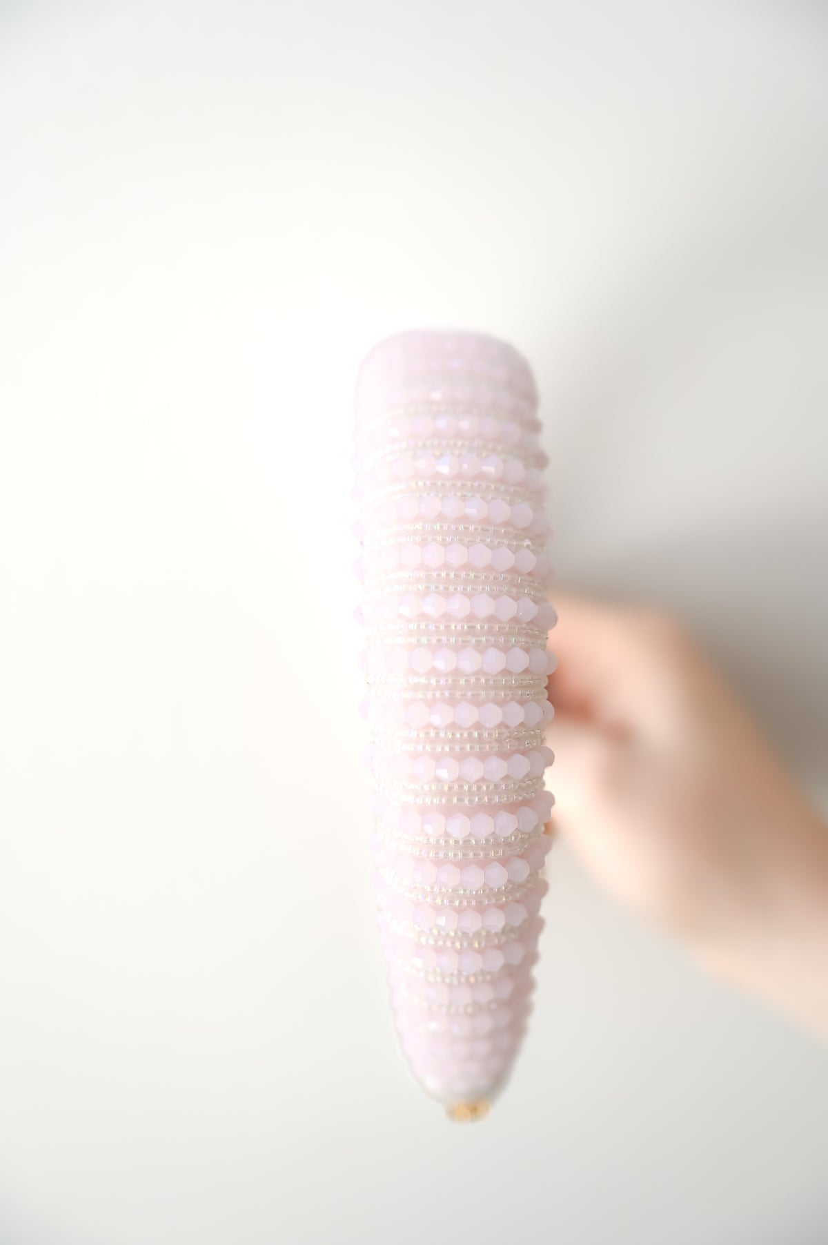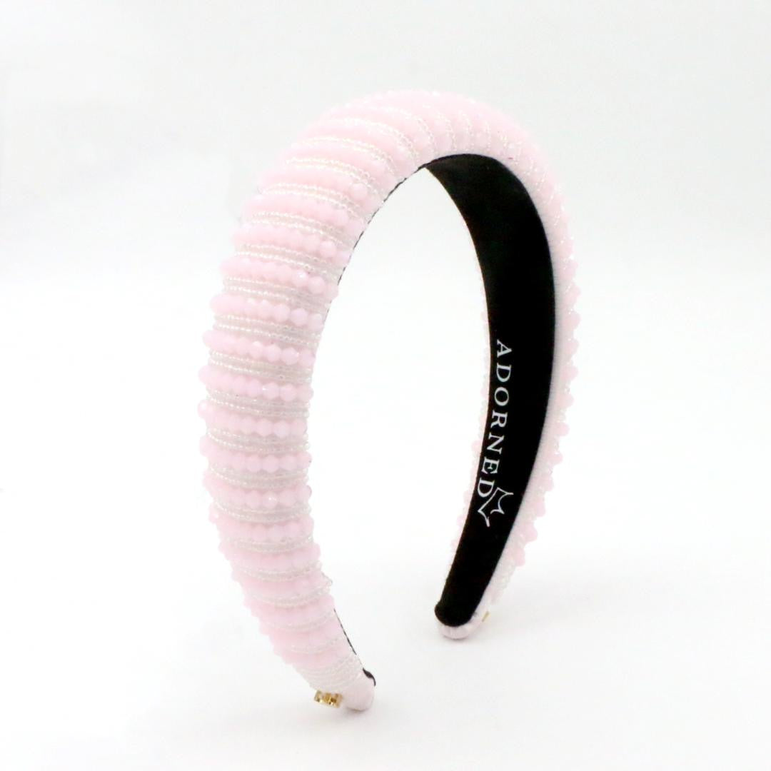 - Hand-sewn pink and clear beads on a 180-degree pink satin band