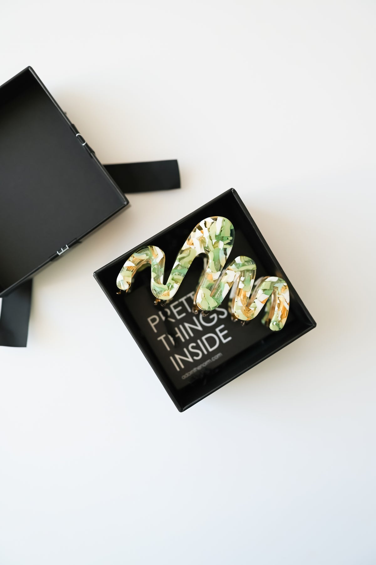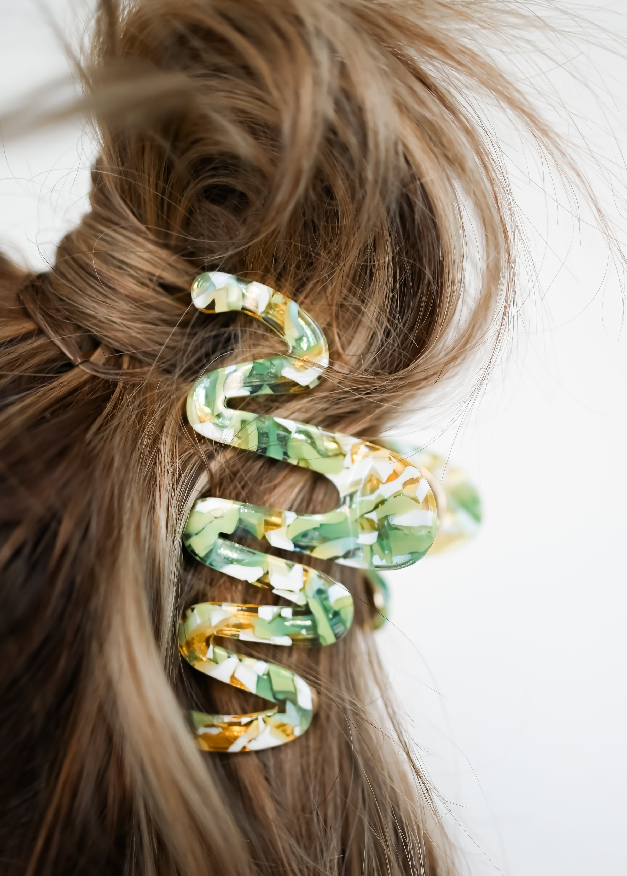 • Green, white, and clear terrazzo clip
